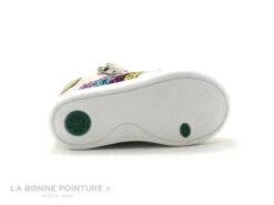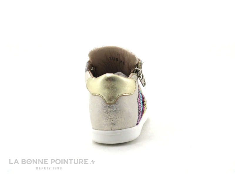Cette basket montante fille est en cuir veloutĂ© blanc pailletĂ© bronze, avec un petit empiècement dorĂ© sur l’arrière.