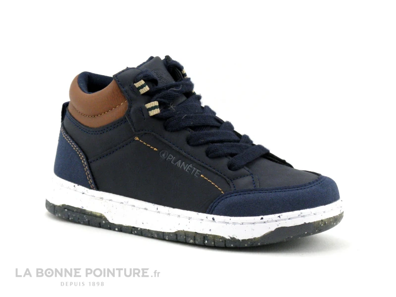 Cette chaussure montante garçon Alma Planète est bleu marine, avec une petite touche de marron camel Ă l’arrière.