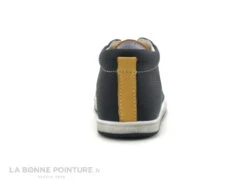 Ce bottillon premiers pas Bellamy combine un cuir bleu marine aspect poinçonné et un cuir jaune moutarde.