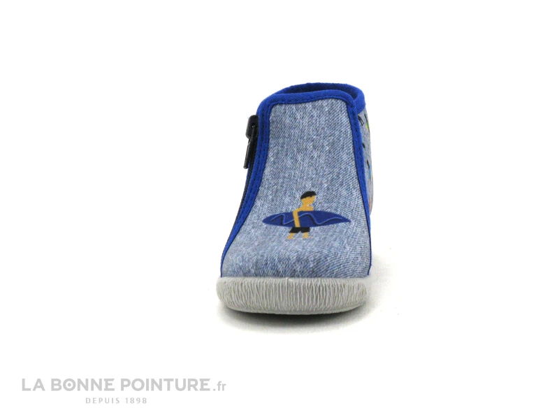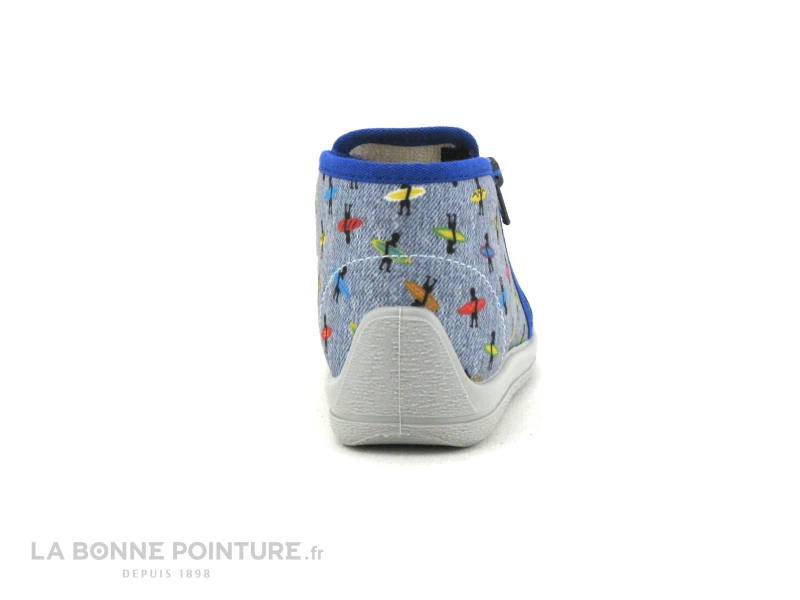 Ce chausson enfant avec fermeture éclair est en toile bleu jeans imprimée de petits surfeurs de toutes les couleurs (chausson avec motif différent pied droit / pied gauche).