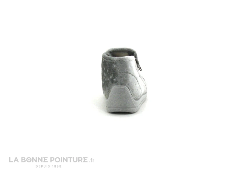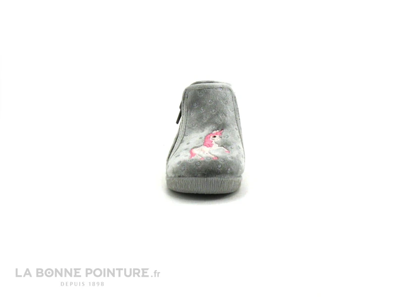 Ce chausson avec licorne Bellamy Kub est en velours gris clair, avec une licorne rose brodĂ©e Ă l’avant.
