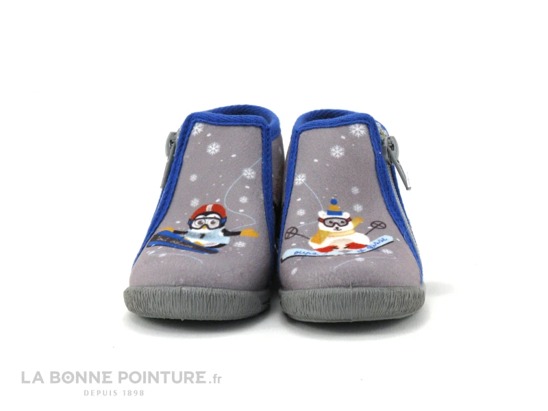 Les deux chaussons Bellamy sont diffĂ©rents, l’un avec un petit pingouin en snowboad et l’autre avec un ourson Ă skis, sous les flocons !