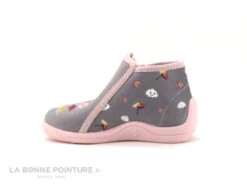 Cette pantoufle bĂ©bĂ© Bellamy est en textile veloutĂ© gris, avec des arcs-en-ciel, des petits nuages et des parapluies Ă l’arrière.