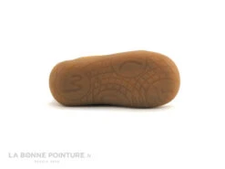 Cette chaussure montante premiers pas est en cuir velouté aspect peau de pêche marron camel, avec un peu de marron foncé autour de la cheville.