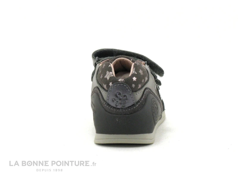 Cette chaussure semi-montante fille mélange cuir lisse et cuir velouté gris, avec de petites étoiles argentées.