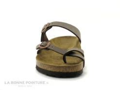 La doublure des mules est en textile, et la semelle interne Ă forme emboitante et anatomique est en cuir velours marron.