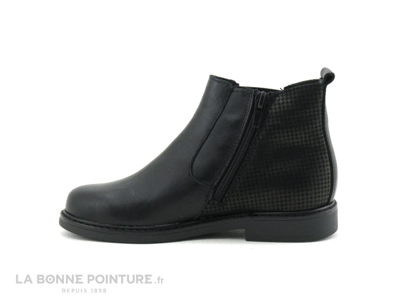 Ce bottillon fille est en cuir lisse noir, avec la partie arrière fantaisie et veloutée.