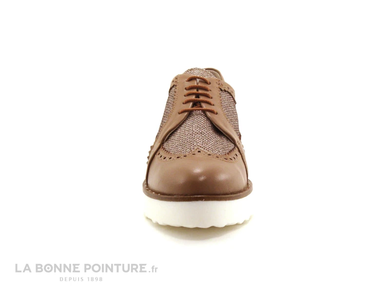 Cette chaussure Femme est en cuir marron clair, avec des empiècements argent mĂ©tal, de fines perforations et des dĂ©coupes dentelĂ©es…