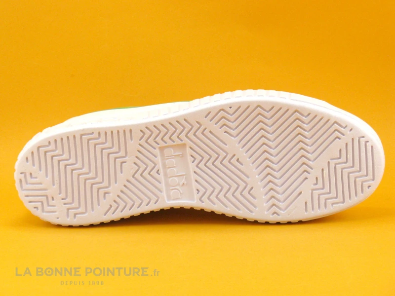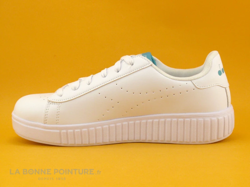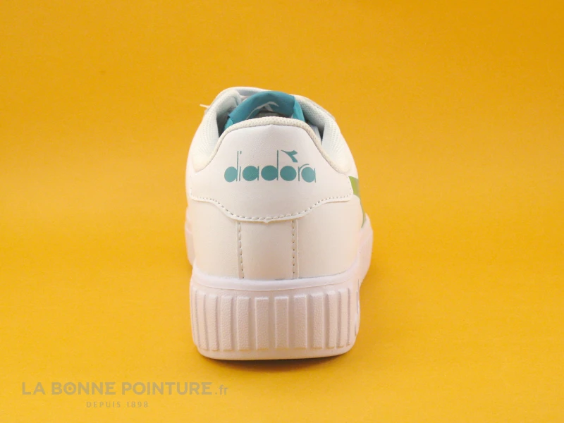 Ces sneakers fille-femme sont en simili cuir blanc, avec la languette verte le logo de la marque Diadora et vert hologramme sur un côté.