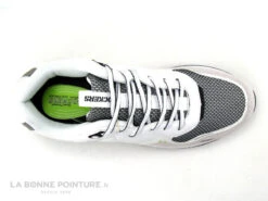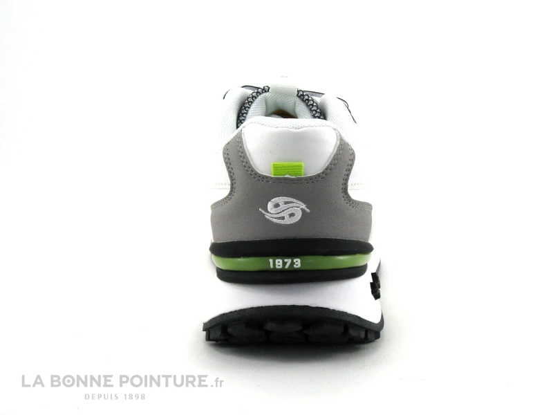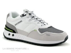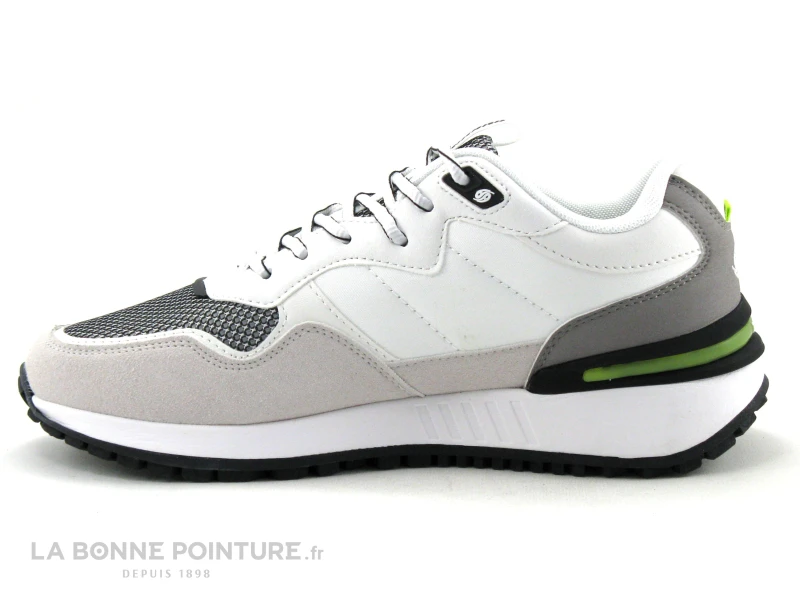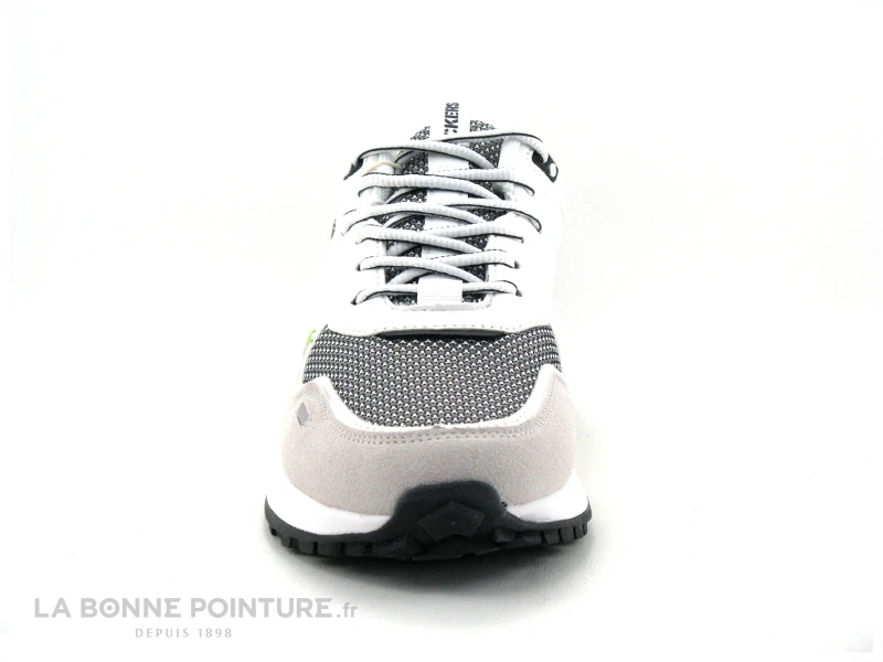 Ces sneakers mode Homme Dockers by Gerli mĂ©langent du blanc, du gris et du beige taupe, avec un peu de noir et de vert lime Ă l’arrière.