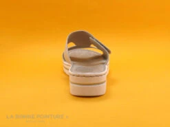 Cette chaussure ouverte femme combine un cuir gris clair et un cuir argent métal.