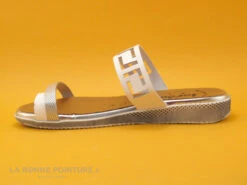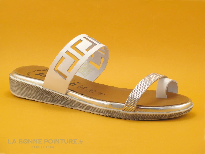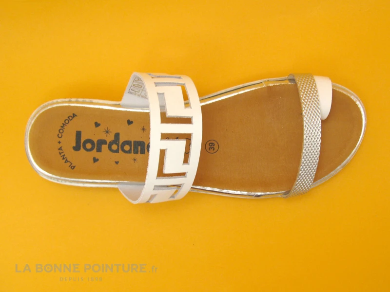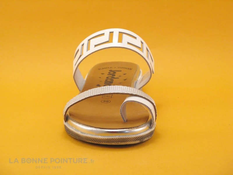 Ces entre-doigts Femme Jordana 3466 combinent un cuir lisse blanc avec découpes et un cuir argenté avec léger relief.