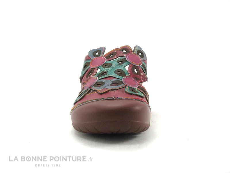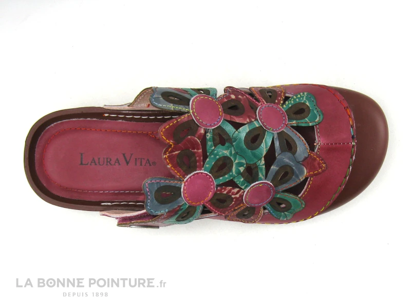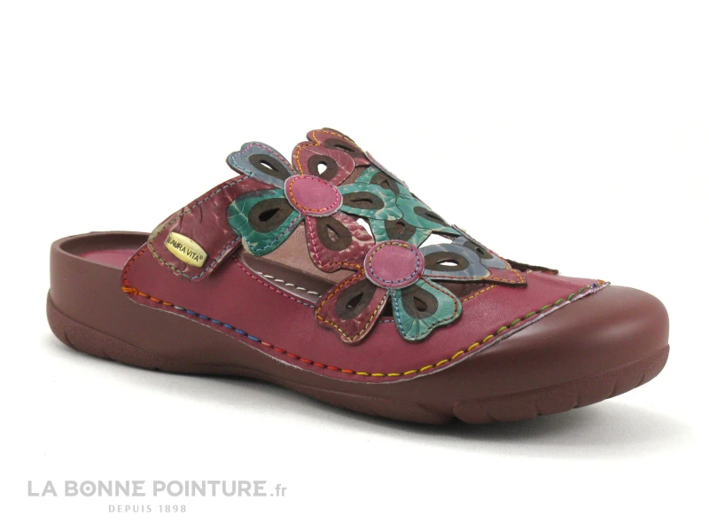 Ce sabot souple Femme Laura Vita est en cuir rose foncé (violine), avec des fleurs multicolores.