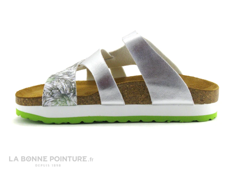 Cette mule compensĂ©e est en simili cuir argentĂ© et imprimĂ© feuillage aux tons de vert, de gris et d’argent.