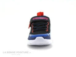 Cette basket bébé lavable en machine Skechers Shark Wave est en textile et matières synthétiques résistantes, aux tons de noir, de bleu et de rouge.