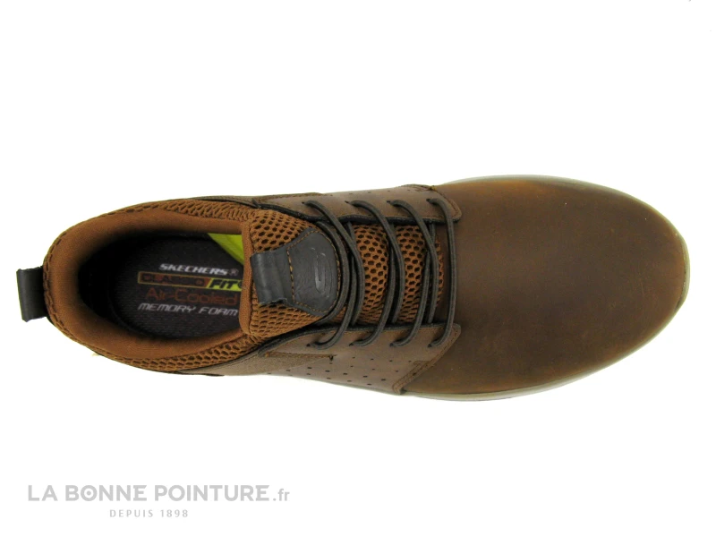 Cette basket facile à enfiler Skechers Streetwear Homme 65870 associe cuir gras et simili cuir marron, avec une partie en maille un ton plus clair et un élastique marron sur le côté externe.