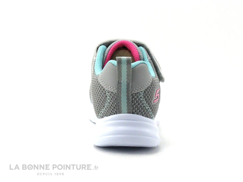 Cette basket clignotante fille Skechers est grise et rose fuchsia, avec l’intĂ©rieur vert d’eau.