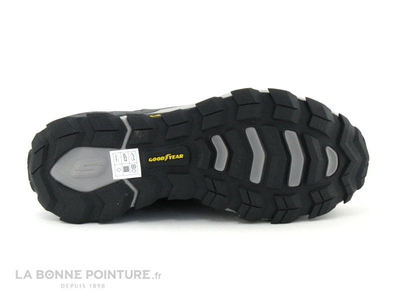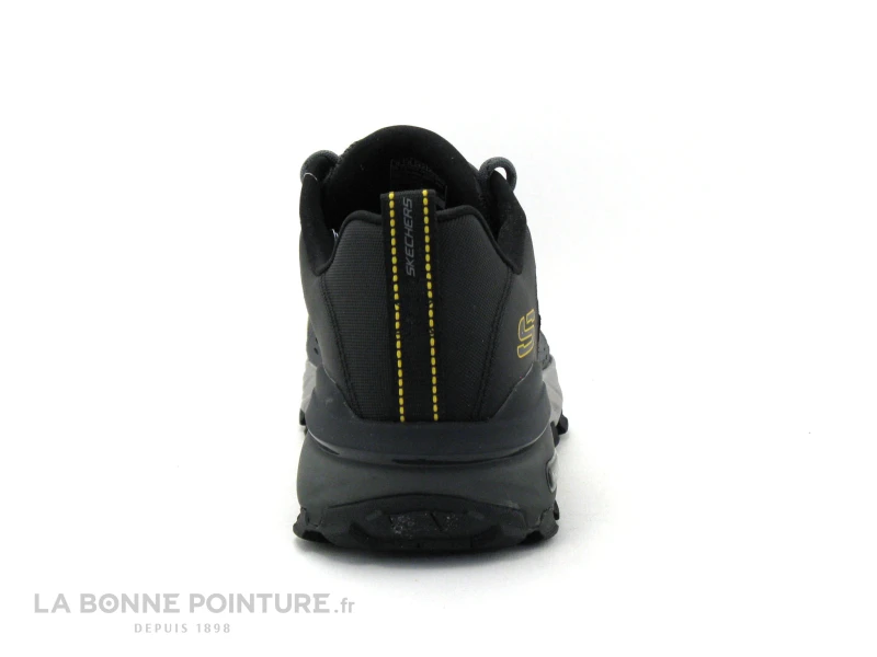 Cette chaussure de rando Homme Skechers est noire et grise, avec un peu de jaune.