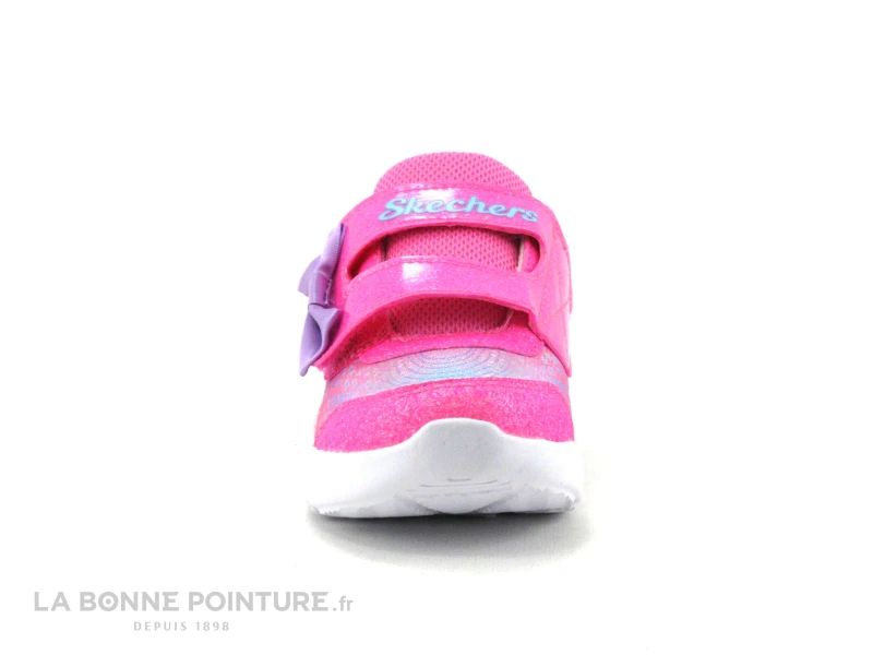 Cette basket à leds fille Skechers Lights® 302654 mélangent du rose, du violet et du bleu turquoise, avec des paillettes argentées.