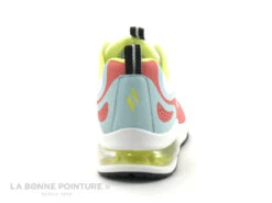 Cette basket Femme Skechers Uno Breath Easy est en textile et matières synthĂ©tiques rĂ©sistantes blanc, vert d’eau, rose et jaune.