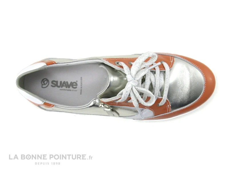 Cette basket confortable Femme Suave Florence mélange un cuir verni orange, un cuir argent et un cuir lisse blanc.